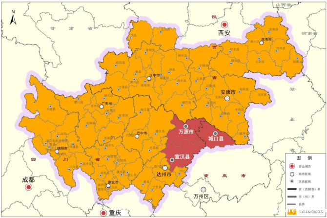 重庆市城口县和四川省宣汉县、万源市地处川陕渝结合部的大巴山南麓,同属川陕革命老区核心区和原秦巴山区集中连片特困地区,是川东北渝东北毗邻地区向北联结关中平原的重要门户,总面积11628平方公里,2020年户籍人口210万、实现地区生产总值589.6亿元、城镇化率42.7%。该区域资源禀赋良好,天然气、锂、钾等矿产资源储量丰富,富硒茶叶、道地中药材等特色农产品在全国享有较高知名度;生态地位重要,处于南北气候过渡带,森林覆盖率达到65.6%,是长江上游重要生态屏障和秦巴生物多样性生态功能区的重要组成部分;历史底蕴深厚,有古巴国罗家坝遗址、古蜀道(荔枝道)等历史遗存;红色文化深入人心,有红三十三军旧址、万源保卫战等红色遗迹遗址。
