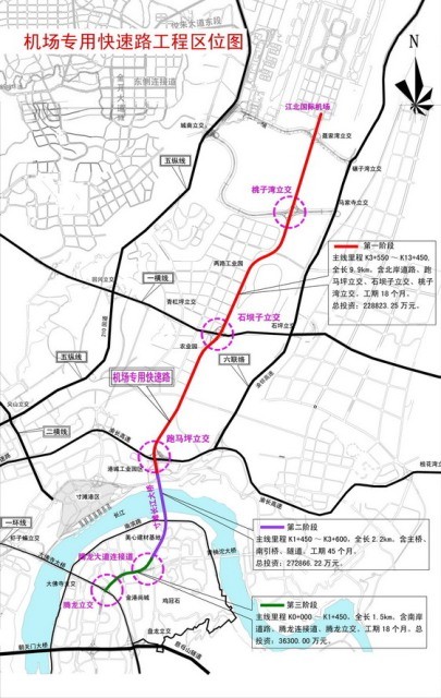 目前我市正在开展重庆机场专用快速路项目前期论证研究,初步提出,拟建的机场专用快速路南起于南岸弹子石片区的盘龙立交,往北经寸滩大桥跨越长江、海尔路,上跨渝长高速形成跑马坪立交,往北与中环线形成石坝子立交,从农业园区和两路开发区东侧经过,与规划的机场南联络线相交形成桃子湾立交,终点为机场第三号航站楼,全长13.45公里,按城市快速道标准设计,双向八车道,总投资53.79亿元。分三阶段建设。第一阶段为机场快速路北段,主要作用为尽快为210国道分流,总投资22.88亿元;第二阶段为寸滩大桥及引桥建设,主要作用为将南岸至机场大部分交通量引入快速路,总投资27.28亿元;第三阶段为南岸接顺段,主要作用是保证路网完整性,衔接南岸路网,总投资3.63亿元。